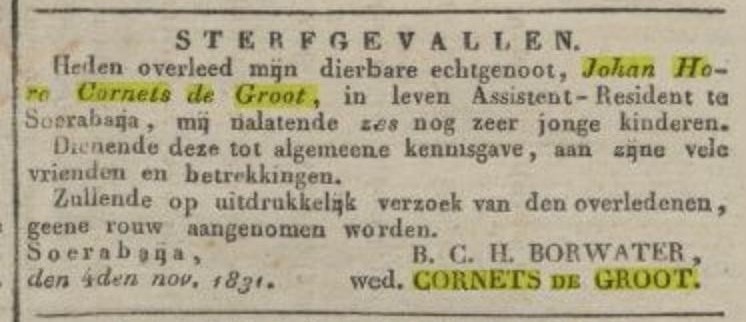 Het overlijdensbericht werd in Soerabaja geplaatst door zijn zoon, tevens mijn overgrootvader jhr. Willem August Cornets de Groot – over wie in het volgende hoofdstuk meer – samen met zijn zus C. Davids, geboren jkvr. Brigitte Constance Henriette Cornets de Groot, en haar echtgenoot Henry Vavasour Saunders Davids, consul van Groot-Brittannië te Batavia.16