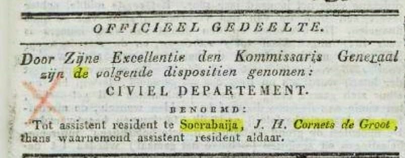 Johan Hora Cornets de Groot (zoon van A.D.). Assistent-resident van Buitenzorg, Krawang en Soerabaja. |